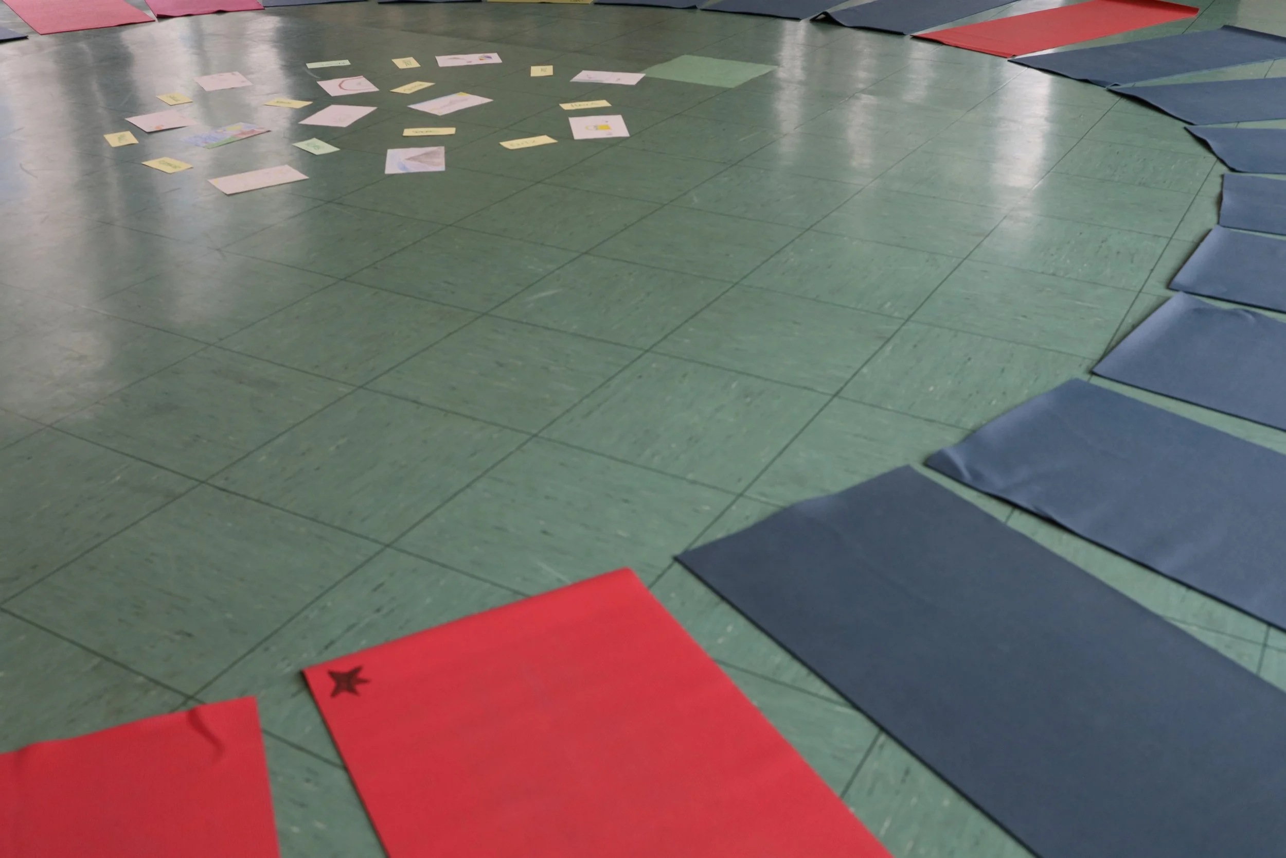 Ein Abschlussritual, meist ähnlich dem vom Beginn der Stunde, schließt die Yogastunde ab. Anschließend säubern alle Kinder ihre Matten, rollen sie ein und bringen sie in den Schrank zurück. Denn auch die Pflege der Matten gehört dazu. Jedes Kind trägt hier Verantwortung.